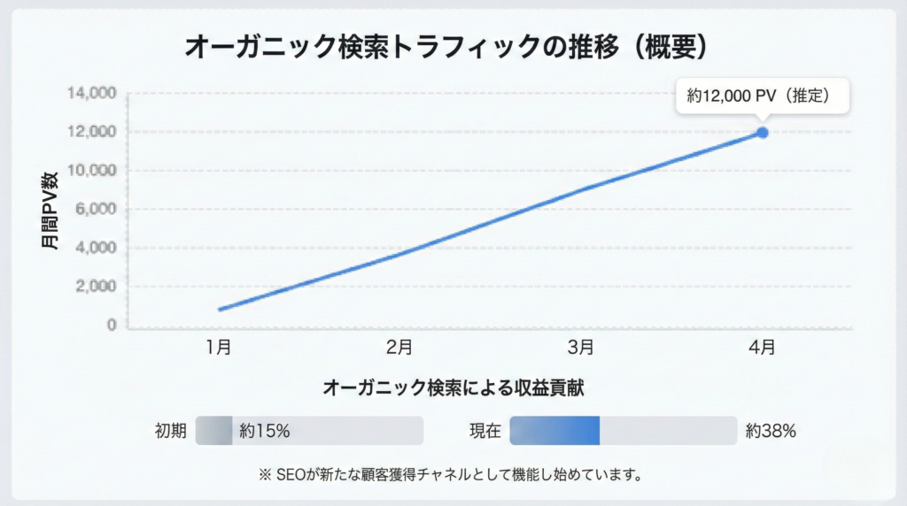 施策開始から約4か月で、オーガニック検索からの流入は月間12,000PVまで増加しました。自然検索経由の売上比率は15%から38%に拡大し、広告費を抑えながらも全体売上を維持できる体制が整いました。新規顧客の流入経路としてもSEOが機能し始めています。