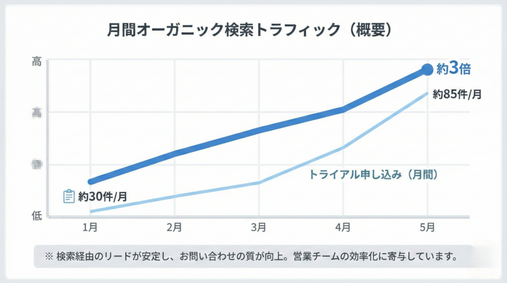 施策開始から約5か月で、自然検索からの流入は約3倍に増加しました。トライアル申込数は月30件から85件へと伸び、検索経由のリードが安定して獲得できるようになりました。営業部門でも、検討度の高い問い合わせが増えたことで対応効率が改善しています。