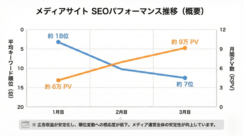 施策開始から約3か月で、主要キーワードの平均順位は18位から7位へと改善しました。月間PVは約6万から9万まで増加し、安定したトラフィックを確保できるようになりました。広告収益も順位変動に左右されにくくなり、メディア運営の安定性が向上しています。