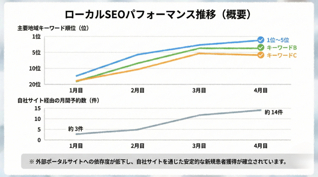 この事例の本質は、「地域名を入れればよい」という発想から、「地域の検索ユーザーが求める情報を用意する」という視点へ切り替えた点にあります。施術内容を分け、症状ごとに丁寧な説明を行うことで、検索意図とのズレを解消しました。