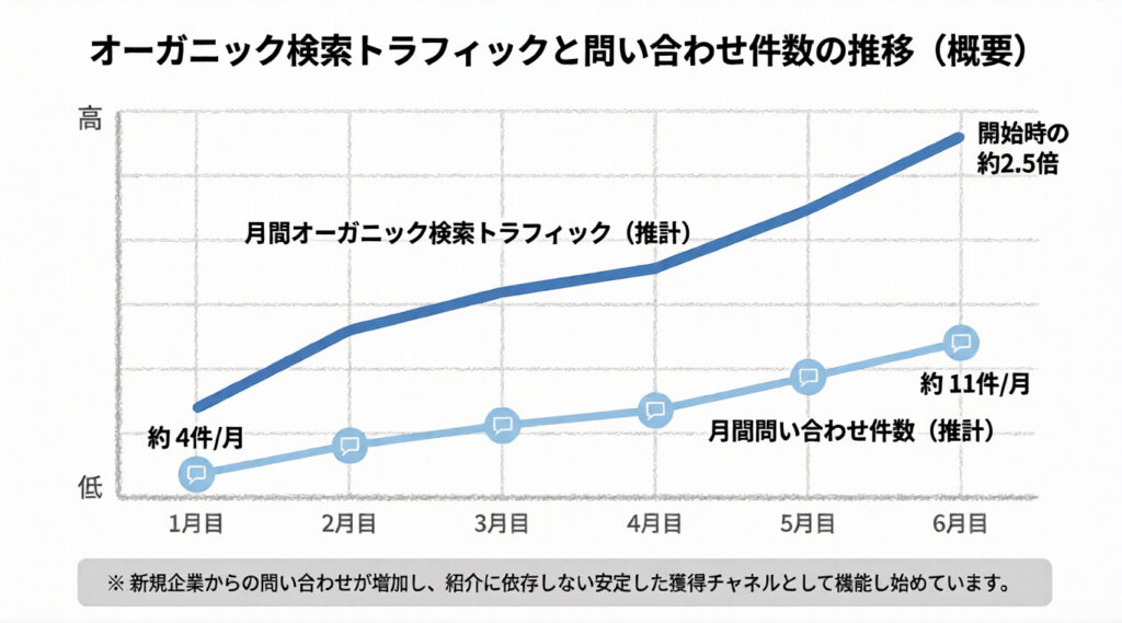 施策開始から半年後には、自然検索流入が約2.5倍に増加しました。これまで接点のなかった新規企業からの問い合わせが増え、月4件程度だった相談件数は11件まで伸長しています。紹介に依存しない集客チャネルとして、SEOが機能し始めました。