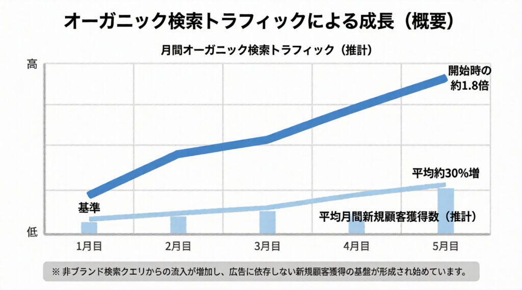 施策開始から5か月後には、オーガニック検索流入が約1.8倍に増加しました。商品名検索以外からの流入が増え、新規購入者数は月平均で約30%伸長しています。広告に依存せず、新規顧客を獲得できる基盤が整い始めました。