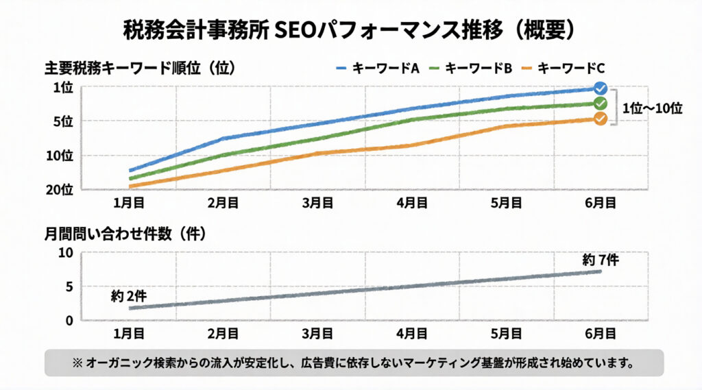 施策開始から約6か月で、主要な税務関連キーワードが検索結果の10位以内に入りました。検索流入が安定し、問い合わせ件数は月2件から7件へ増加しています。広告費に左右されない集客基盤が整い始めました。