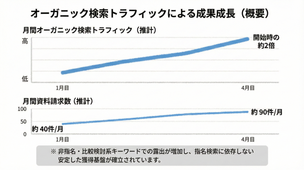 施策開始から約4か月で、自然検索流入は約2倍に増加しました。比較・検討系キーワードでの露出が増え、資料請求数は月40件から90件へと伸びています。指名検索に依存しない集客基盤が形成されました。