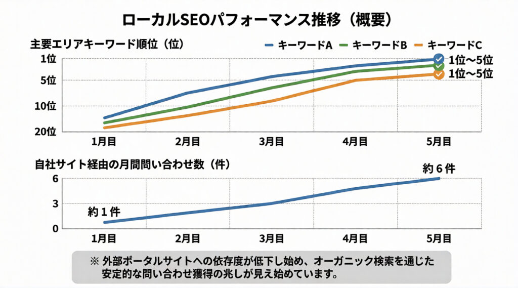 施策開始から約5か月で、主要なエリアキーワードが検索結果で上位表示されるようになりました。自社サイト経由の問い合わせは月1件から6件へ増加しています。ポータルサイトに依存しない反響獲得の兆しが見え始めました。